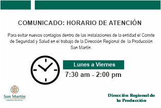 - Se varíe el horario de trabajo presencial de los colaboradores de la Dirección Regional de la Producción, de lunes a viernes 7:30 am a 2:00 p.m., por el tiempo que sea conveniente para evitar nuevos contagios dentro de las instalaciones.